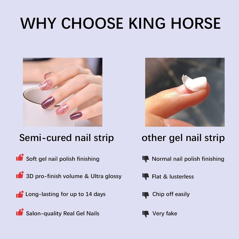 KING HORSE Semi Cured Gel Nail Stickers 24pcs Long Lasting Nail Polish Wraps Salon-Quality Semi-Cured Gel Nail Strips UV Lamp Required Semicured Gel Nail Wraps for Women