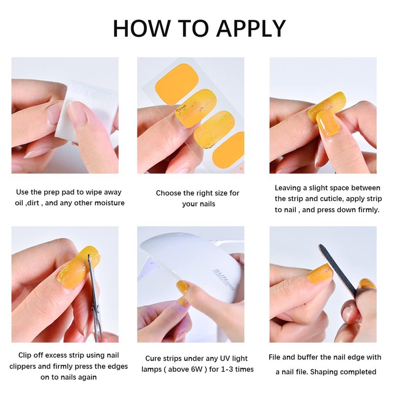 - Durable & Long-lasting - Cured 60% in advance, our semicured nail strips are made with real liquid gel. And with its waterproof top gel layer, our gel nail polish strips can last up to 14 days once completely cured under a UV lamp. You won't have to worry about them chipping off! Option to use a top coat to add shine and last even longer.