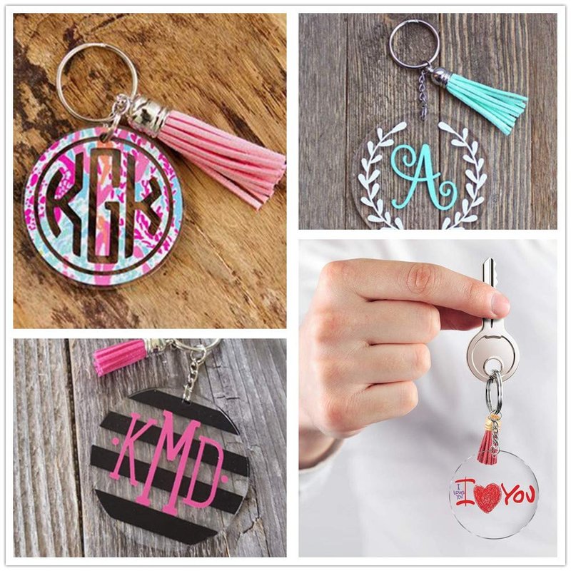 - DURABLE MATERIAL: The keychain rings are made of super strong silver nickel metal, fine workmanship, smooth surface and edge, won't scratch your hands and clothes. Acrylic blanks are made of high quality acrylic material, durable.The tassel consists of plastic cap and leather suede tassel, light and beautiful.