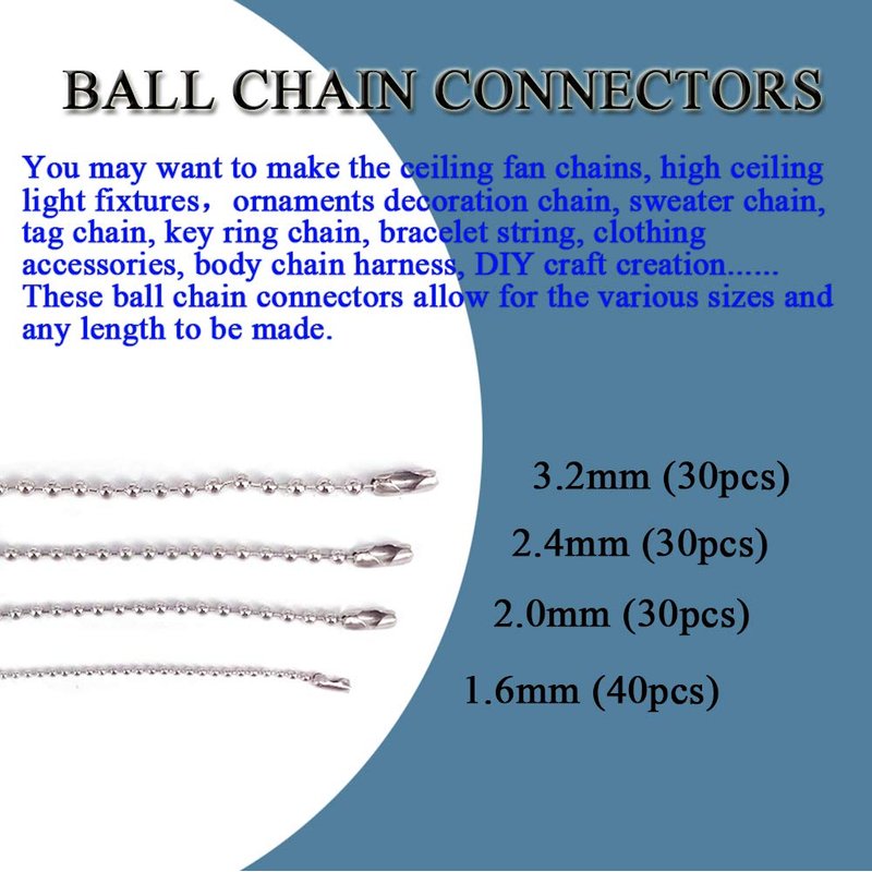 - Multiple Sizes — 4 Sizes Available: package includes 80pcs ball chain connectors - fit for 1.6mm(20pcs)/2mm(20pcs)/ 2.4 mm(20pcs) /3.2mm(20pcs).