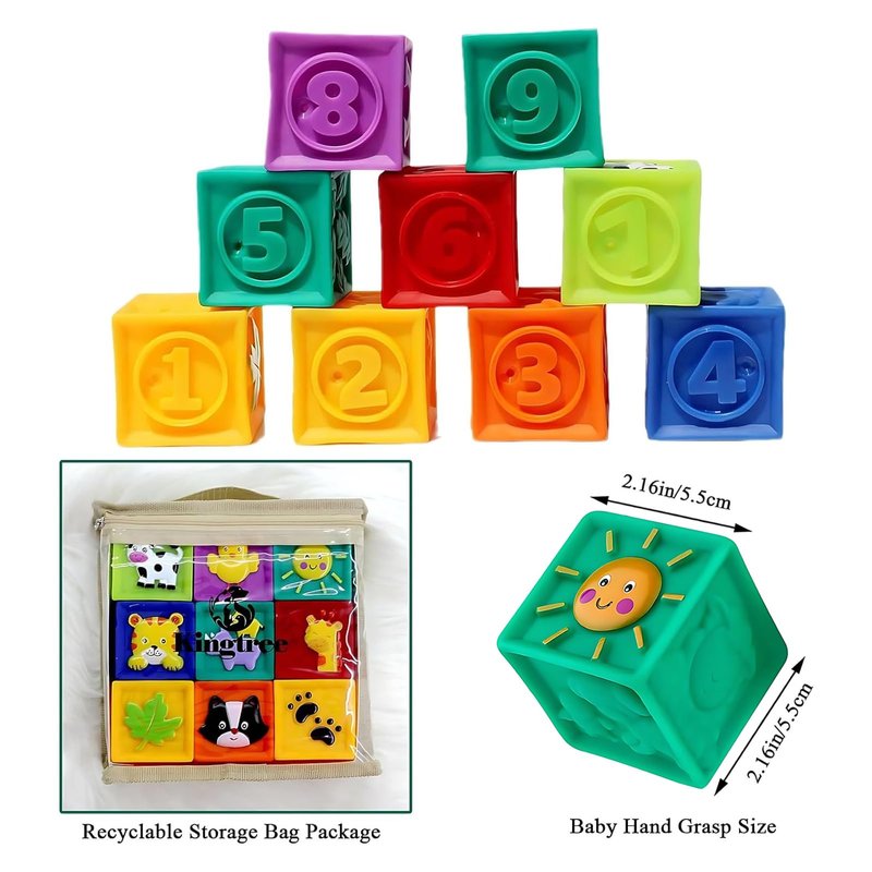 Kingtree Baby Blocks, 9PCS Soft Squeeze Building Blocks Stacking Toys for 6+ Months Babies, Baby Teething Chewing Educational Blocks Set with Numbers Animals Shapes Textures