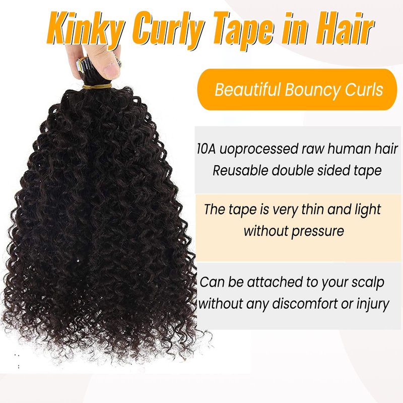 - 【Premium Kinky Curly Tape in Hair Extensions】:Kinky curly tape in hair extensions,made of 100% 10A Premium same direction cuticle aligned virgin hair.It is suitable for black women.No tangles,no shedding.The tape is thin and light, without pressure, it is perfectly attached to your scalp without any discomfort or injury. Curly remy hair extension can be cut, washed, dyed, straighten and curled.