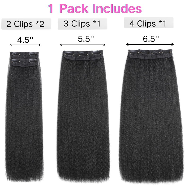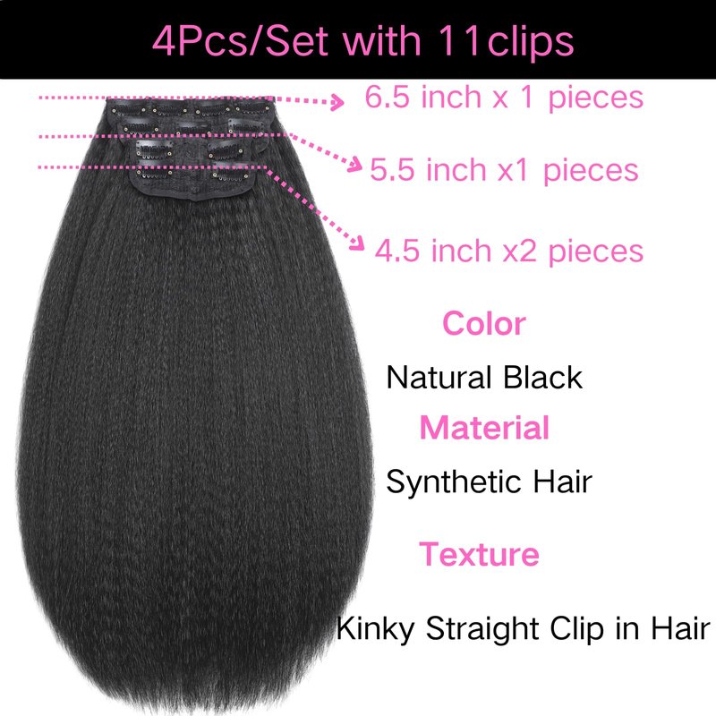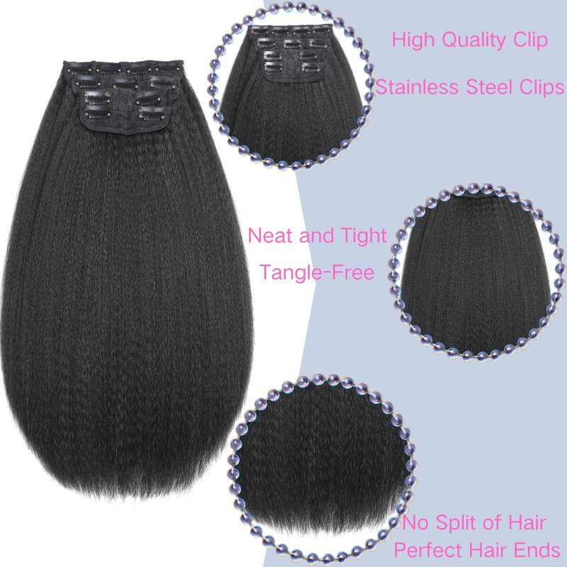 Kinky Straight Clip in Hair Extensions for Black Women Natural Black Full Head Yaki Kinky Straight Synthetic Hair 4Pcs 11 Clips 140g/Set (16 inch)