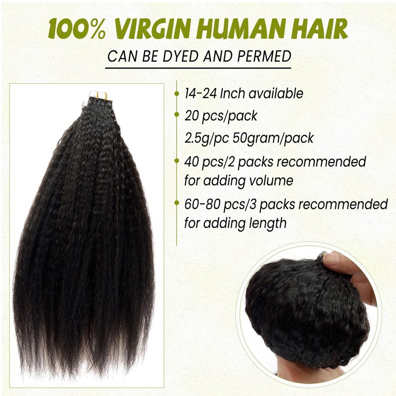 - 【Tape in Hair Extensions Human Hair for Black Women】---Kinky straight tape in extensions, made of 100% 9A Premium same direction cuticle aligned virgin hair. Natural black hair extensions kinkys straight human hair tape ins is more healthy soft, no dry and no split hair ends. Kinky straight hair extensions real human hair tape in extensions for black women, can be washed, straightened, conditioned and restyled as your own hair .