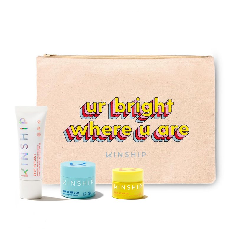 Elevate your skincare routine with this exclusive Kinship bundle, featuring the award-winning Self Reflect SPF 32, Supermello Hydrating Gel Cream, and Brightwave Eye Cream, all thoughtfully designed for sensitive skin. This set delivers comprehensive care, offering broad-spectrum sun protection, deep hydration, and brightening benefits to keep your skin radiant and healthy. Each product is formulated with clean, vegan ingredients and packaged sustainably to minimize environmental impact. The bundle also includes a stylish cosmetic pouch, perfect for organizing your skincare essentials at home or on the go. Made in the USA.