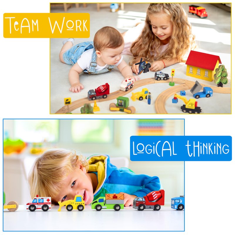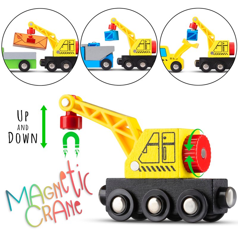 - PLAY & LEARN: Whether used as standalone toys or as wooden train track accessories, these wooden cars encourage hand-eye coordination and imaginative play. Each of the 10 vehicles is brightly colored, easy to identify, and fun for kids to grasp and maneuver. The set includes a working crane car for picking up cargo, and several vehicles with removable cargo, adding an extra layer of fun and promoting fine motor skills development