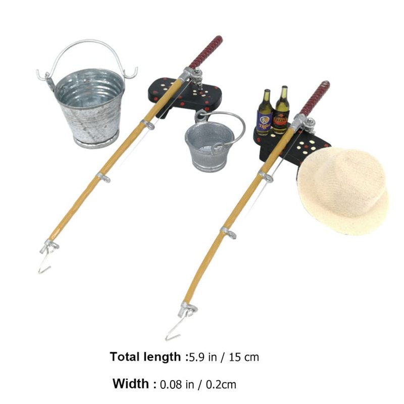 Kisangel 1Set Miniature Fishing Pole Dollhouse Fishing Rod Set Miniature Fishing Gear for Mini Bench Hat Beer Bottles Buckets House Decor