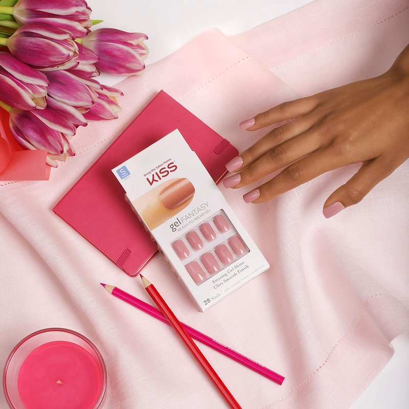 KISS Gel Fantasy Press On Nails, Nail glue included, Ribbons', Pink, Short Size, Squoval Shape, Includes 28 Nails, 2g glue, 1 Manicure Stick, 1 Mini File