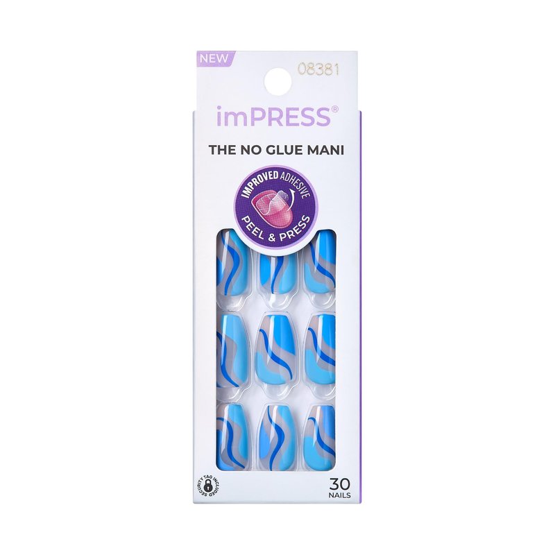 KISS imPRESS No Glue Mani 30 Pcs Press On Nails, Medium Coffin Design Nail, Dynamic Blue Print, Simple Peel & Press Easy Apply, Hassel-Free Removal, Essential Tools Included