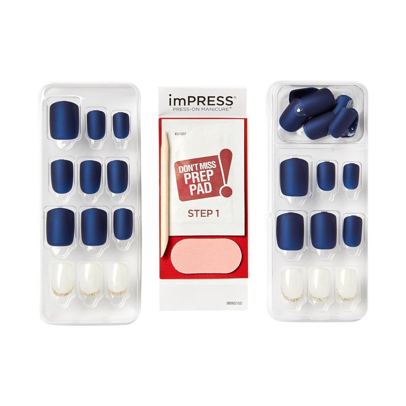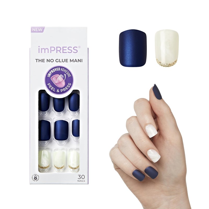 KISS imPRESS No Glue Mani Press On Nails, Design, 'Chasing Stars', Blue, Short Size, Squoval Shape, Includes 30 Nails, Prep Pad, Instructions Sheet, 1 Manicure Stick, 1 Mini File