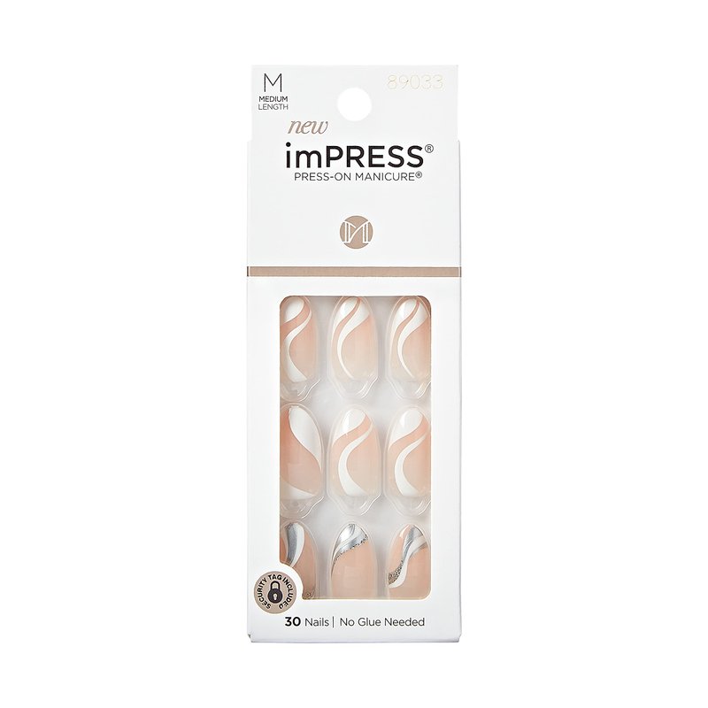 KISS imPRESS No Glue Mani Press On Nails, Design, On My Mind', White, Medium Size, Almond Shape, Includes 30 Nails, Prep Pad, Instructions Sheet, 1 Manicure Stick, 1 Mini File