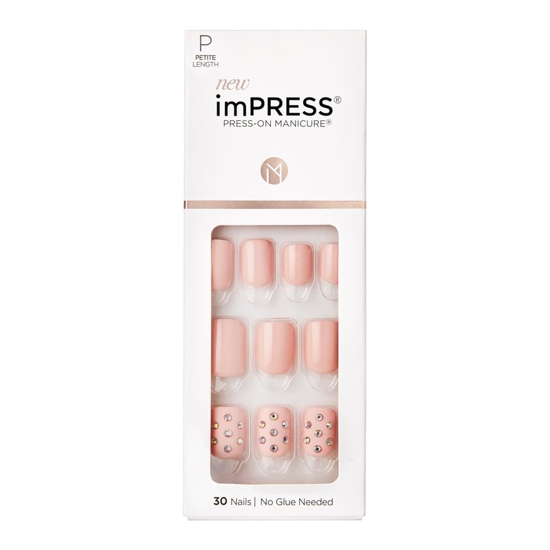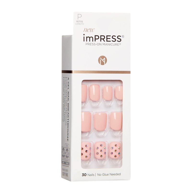 KISS imPRESS No Glue Mani Press On Nails, Design, 'Petite Secrets', Pink, Petite Size, Squoval Shape, Includes 30 Nails, Prep Pad, Instructions Sheet, 1 Manicure Stick, 1 Mini File