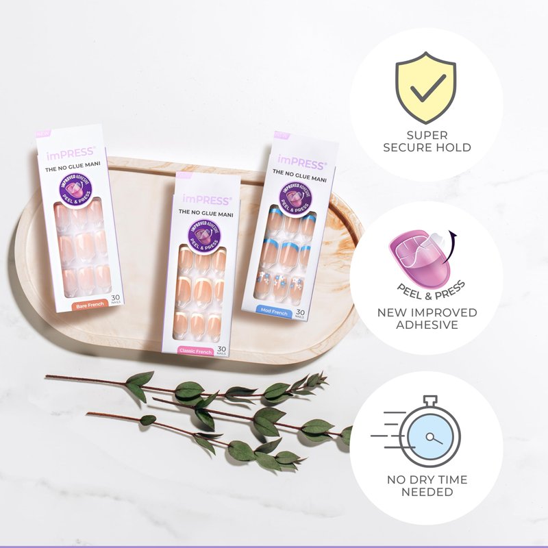 - Fancy a New French: Say “oui” to the NO GLUE needed imPRESS Press-On French Manicure. With our New Improved Adhesive, these press-on nails are long-lasting with a secure hold that lasts for up to 7 days. Just Peel, Press & Go!