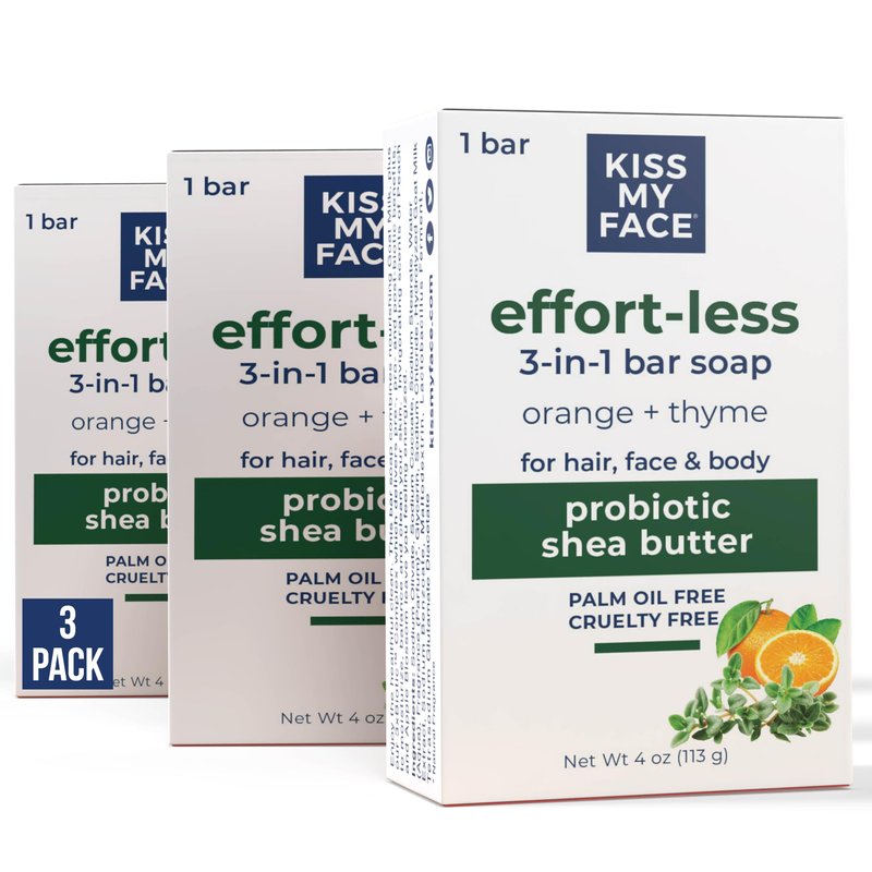 - VERSATILE 3-IN-1 FORMULA. Kiss My Face Effort-Less 3-in-1 Bar Soap is designed for hair, face, and body, combining the benefits of probiotics and shea butter for a comprehensive cleansing experience.