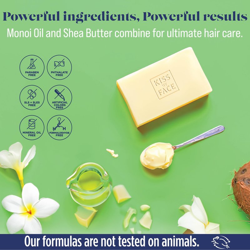 - 4 OZ BAR SOAPS X3. Kiss My Face Strengthen 2-in-1 Monoi Oil and Shea Butter Bar contains 3 – 4oz bar to keep your hair nourished and smooth all day long.