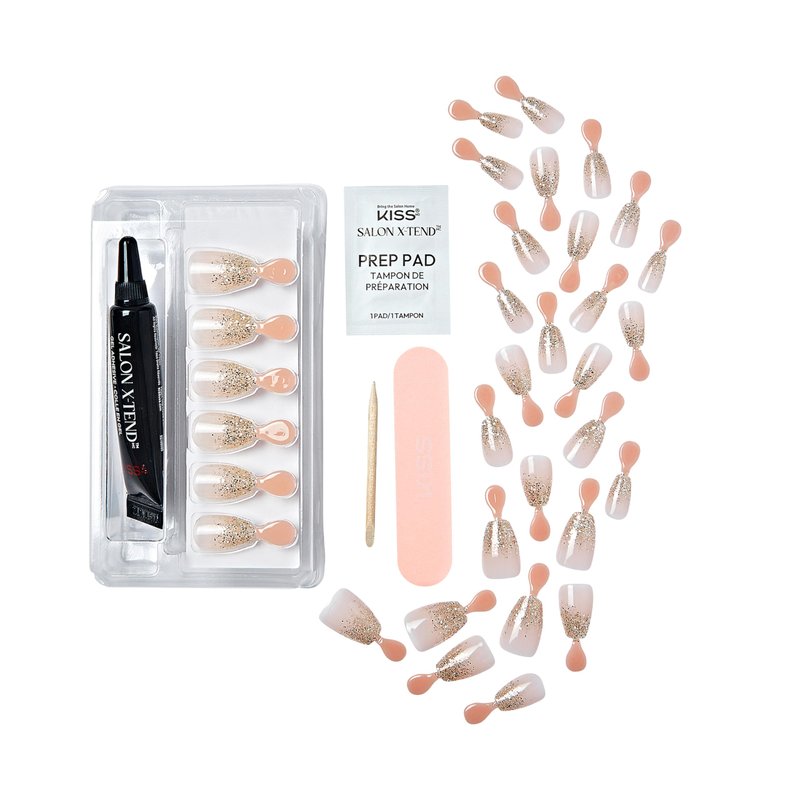 KISS Salon X-tend, Press-On Nails, Nail glue included, 'Red Flags', Light Pink, Medium Size, Almond Shape, Includes 30 Nails, 5Ml Led Soft Gel Adhesive, 1 Manicure Stick, 1 New Mini File, New Prep Pad
