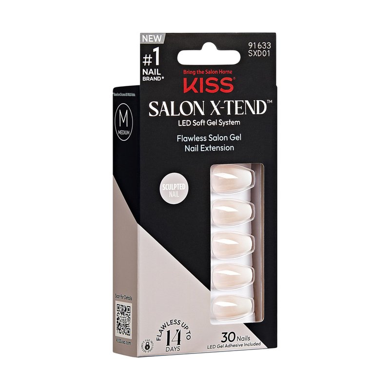 KISS Salon X-tend, Press-On Nails, Nail glue included, 'Words', Light White, Medium Size, Coffin Shape, Includes 30 Nails, 5Ml Led Soft Gel Adhesive, 1 Manicure Stick, 1 New Mini File, New Prep Pad
