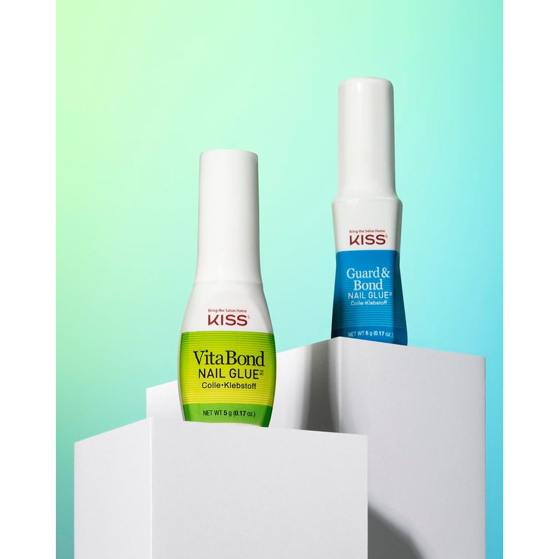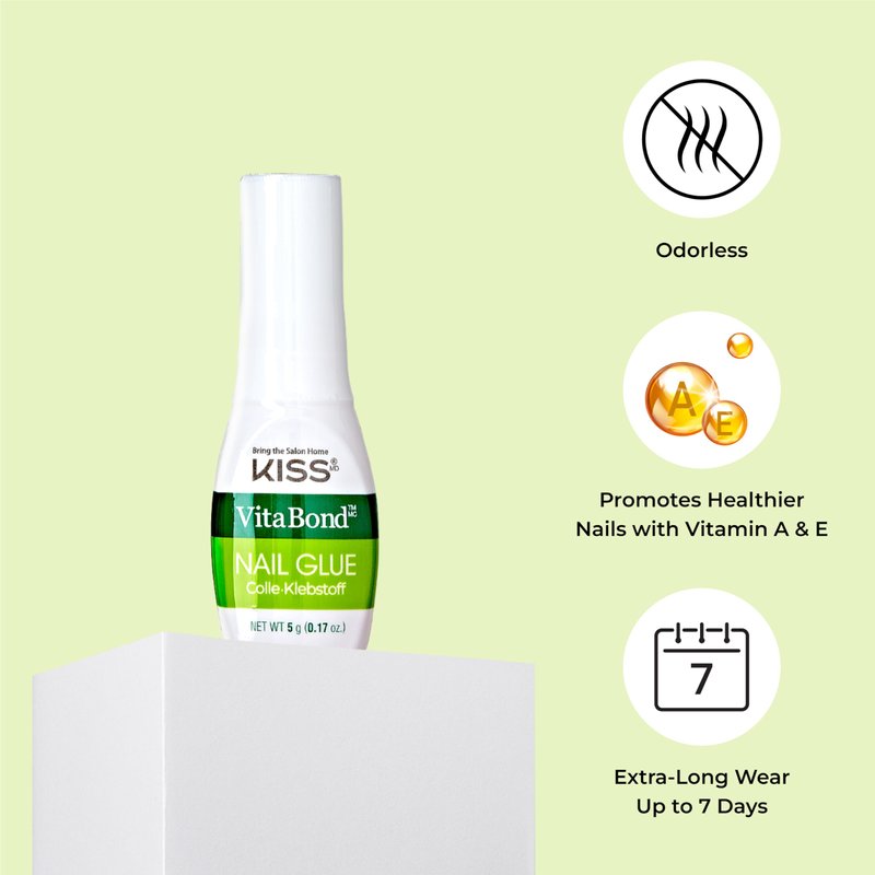 - Advanced Nail Care: KISS VitaBond Nail Glue helps promote healthier nails; Infused with nourishing Vitamin A and Vitamin E, this odorless formula has a pink tint that lets you see where the glue has been applied; Net Wt. 5g (0.17 oz.)