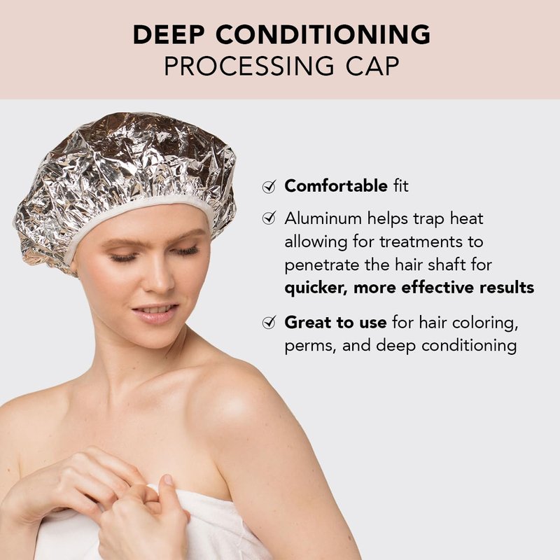 - FOIL HAIR CAP: This hair cap for deep conditioning has aluminum which helps trap heat, allowing color to process more quickly and treatments to penetrate the hair shaft more effectively.