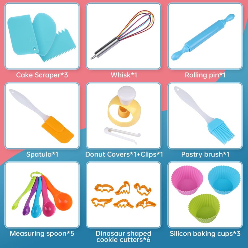- 【COMPLETE REAL KIDS BAKING SET】 kids baking sets for girls Includes Apron, Chef hat, Oven Mitt, Doughnut Mold, Doughnut Clip, Wood Spoon, Rolling Pin, Large colorful hand mixer, Spatula, 3*Scrapers ,brush,3*Cake cups, 6*plastic cookie mold, 5*Measuring Spoon, heat resistant mat. With CPC certificate, passed CPSIA and ASTM standard tests, Completely meet kids' cooking and baking needs!