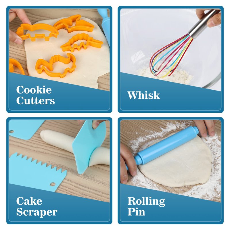 Kkmon Kids Cooking and Baking Set - 28Pcs Includes Kids Chef Hat and Dinosaur Apron ,Oven Mitt and Cooking Utensils , Dress Up Chef Role Play Costume for Toddlers Age 3+ Years Old Girls Boys Toys Gift