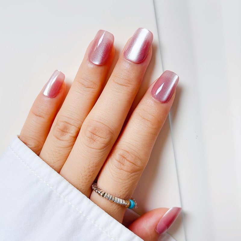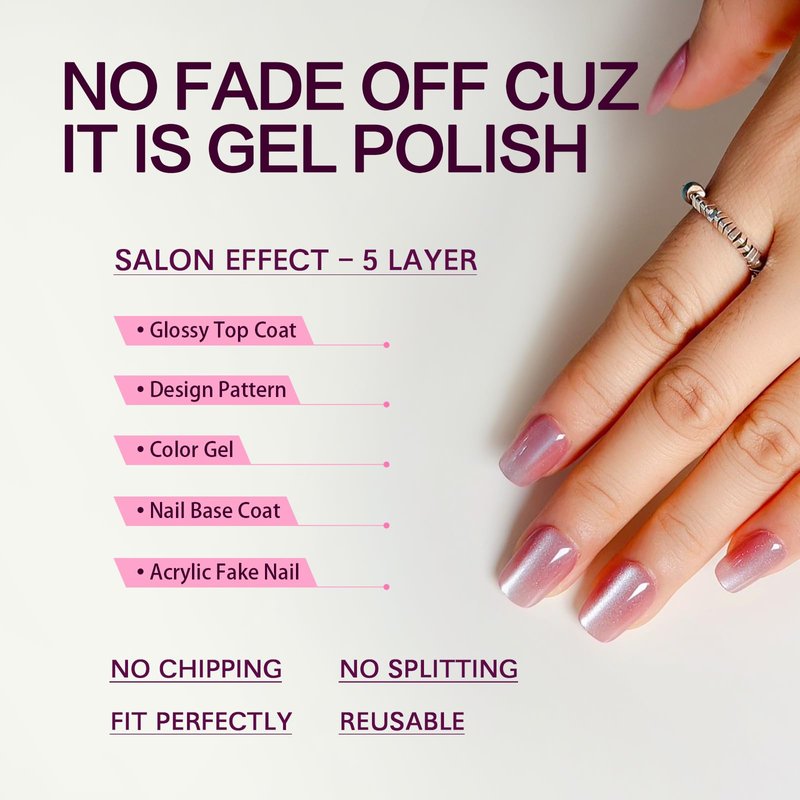 Kliveco 30Pcs Pink Aurora Cat Eye Press on Nails - Handmade Soft Gel Fake Nails with Glue | Semi-Transparent, Short Square Stick On Nails, Reusable & Fit Perfectly | 15 Sizes - 30 Nail Kit