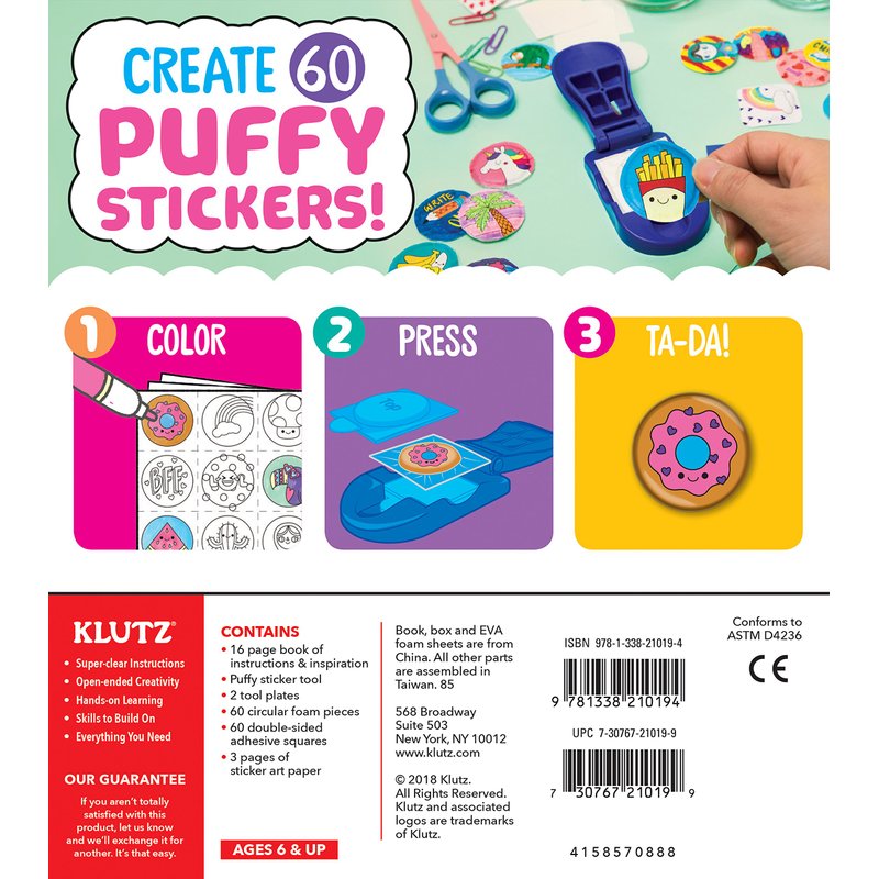 - Includes Klutz custom puffy sticker Maker.