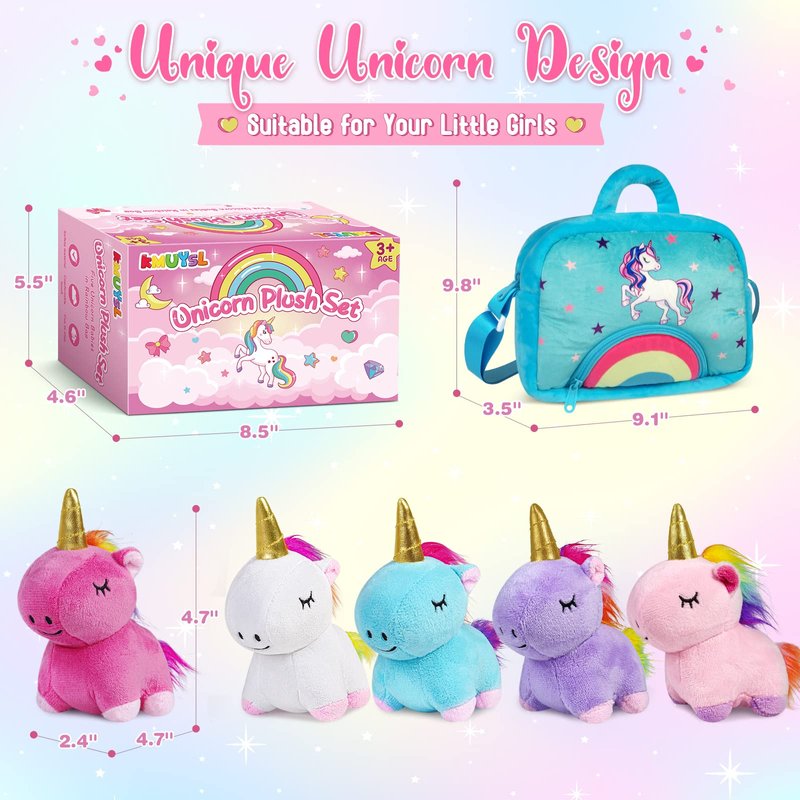 - Perfect Design for Little Girls: 5 Unicorn plushies are assorted color: pink, blue, purple, white and rose-red. Unique and ingenious design includes bright gold horns, iridescent manes and tails. The bag printed with unicorn will be girl's favorite. Your little princess will love them because they are so Cute.