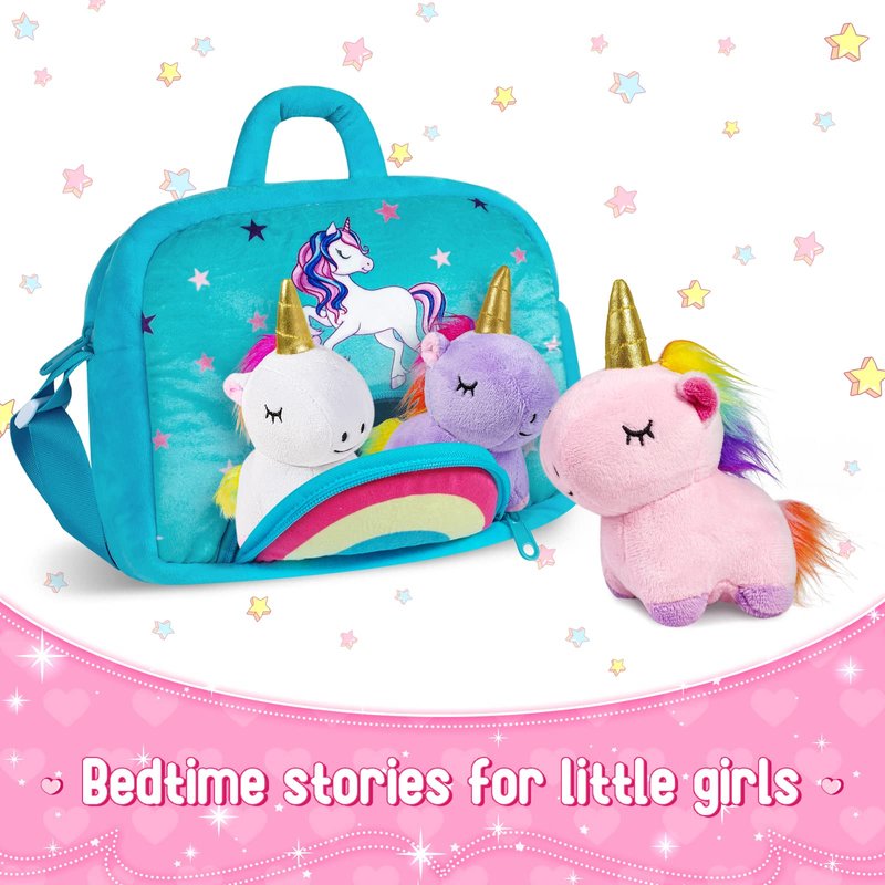 - Unicorn Plush Set: Comes with 5 Piece cute unicorns and 1piece rainbow bag, absolutely, what a great value gift set. How fun is it to take your unicorns from the rainbow door. The girls will love them and can't wait to play with them, the body is very soft, girl can't put it down. Perfect gift choice for ages 3+.