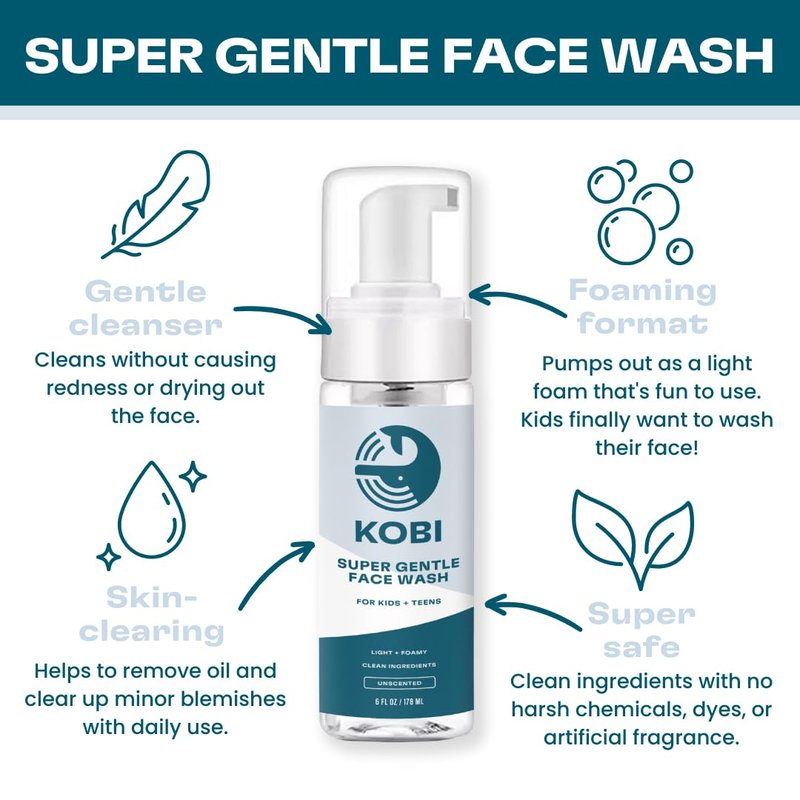 Kobi Gentle Face Wash for Teens, Kids, Boys, Girls - Clear, Dye-Free Formula - Natural Foam Facial Cleanser for Sensitive Skin (6 Fl Oz (Pack of 1), Unscented)