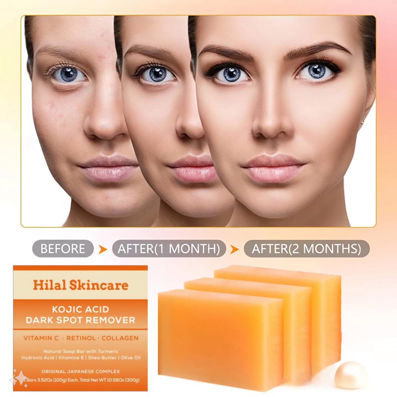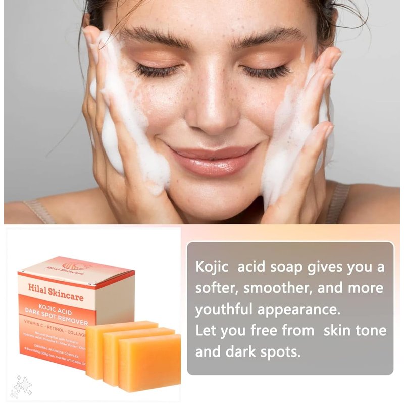 Kojic Acid Soap for dark spot correction with Turmeric, Retinol, Hyaluronic Acid, Vitamin C, Vitamin E, Collagen, Shea Butter, and Olive Oil. Includes Free Soap Bag