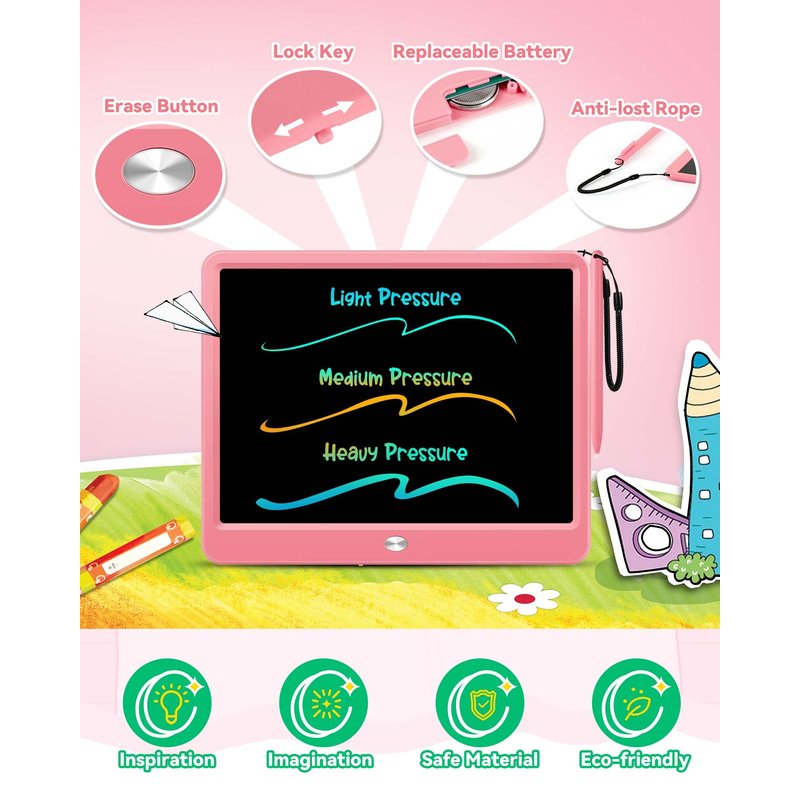 - [Reusable & Environmental]A reusable drawing tablet saves 1,000 sheets of paper. Our drawing boards are very eco-friendly because kids use these pads instead of paper. The writing tablet's battery can be used for 3-6 month and is replaceable. The battery is fixed with screws and are not easily accessible to young children.