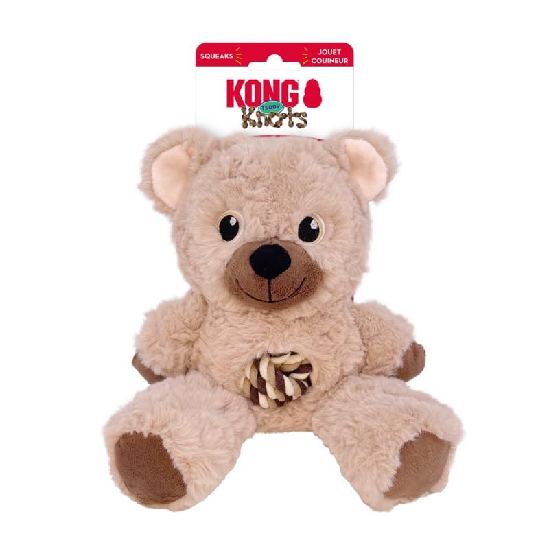 KONG Knots Teddy’s durable knotted rope tummy and tail satisfy natural instincts and make it easy for dogs to pick him up to play for fetching and shaking fun. Squeaker keeps play going. Irresistibly cozy plush and a soft snuggly body invite comforting cuddles when it’s time for a bit of quiet hibernation.