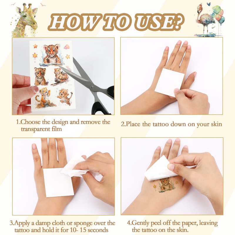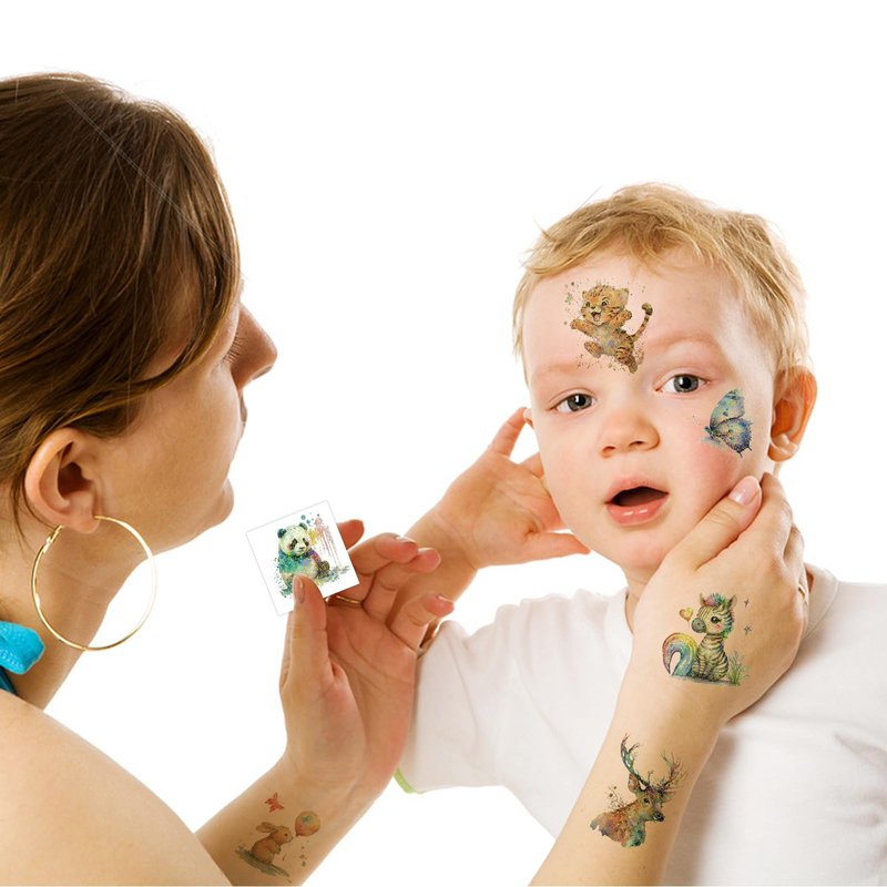 - Applications: Easy to apply, and an instruction is printed on the back. These watercolor zoo party favors tattoos are safe for any place on kids body, including face, arms, hands, ankles and more. Note: Not recommended for sensitive skin or children under 3 years old
