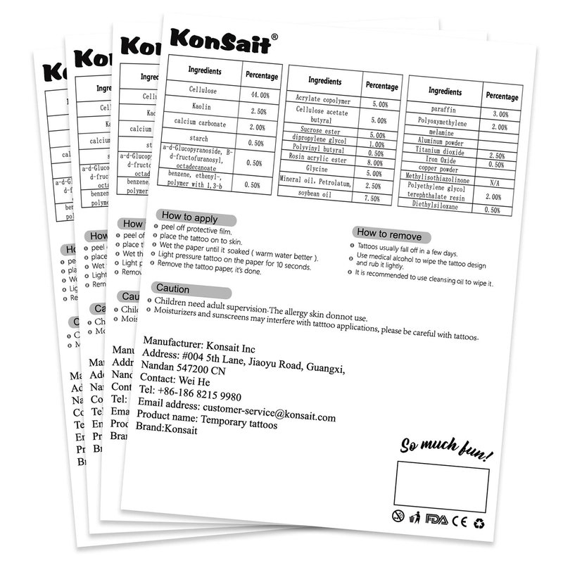 - 【Buy With Confidence】Konsait temporary tattoo stickers meet strict safety and non-toxic material requirements and are quality assured, so buy with confidence! If you have any other questions, please feel free to contact us and we will not hesitate to answer them for you!