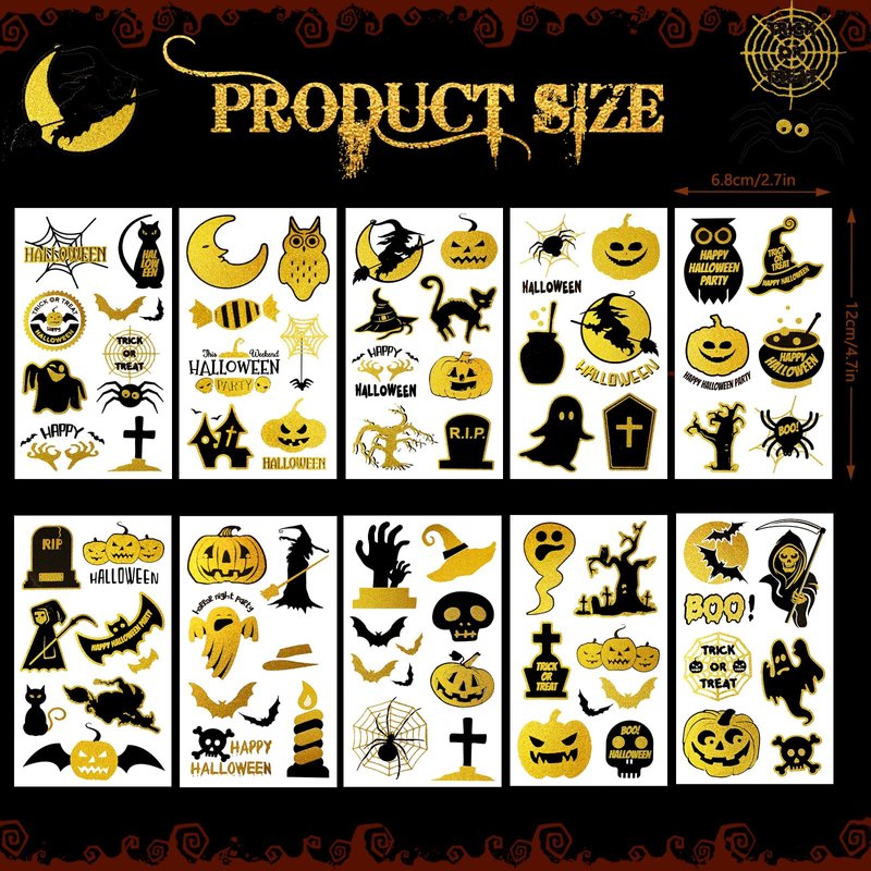 - Flash Gold Halloween Tattoos for Kids : you will receive 10 sheets hot stamping Halloween tattoo with a total of 72 pcs unique patterns to meet your diversified dress up needs.