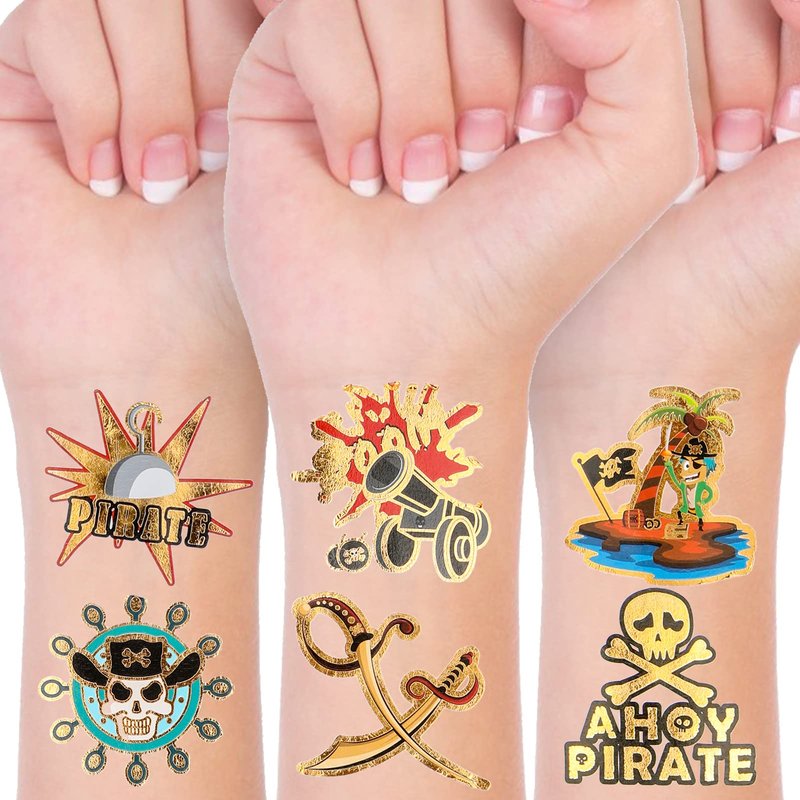 - 【Waterproof and Durable】Great fun pirate theme fake tattoos,uses the latest waterproof technology ,can be used in pool,shower and beach,usually last 3-5 days. Metallic pirate theme styles with brilliant colors and super cute designs,they're the bomb for a nautical birthday parties.Great fun for both children and adults alike!