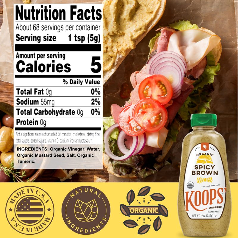 Koops' Organic Spicy Brown Mustard – Bold and Brown Mustard Sauce, Gluten-Free, Kosher, USDA Certified Organic, Made in USA, From Quality Mustard Seeds – 12 Oz, Pack of 1