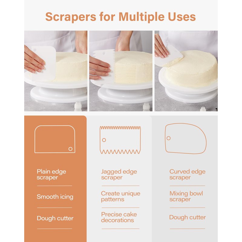 - Essential Cake Decorating Supplies Kit: This baking supplies has everything you need to create beautiful cakes, including 2 frosting spatulas, 3 scrapers, and an easy-to-use cake turntable. No need to buy extra products — all you need is the frosting, the cake, and this cake decorating kit!