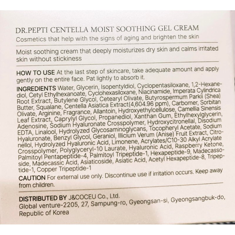 - Intensive Hydration: Dr.Pepti Centella Moist Soothing Gel Cream provides deep, long-lasting hydration for dry, sensitive skin.