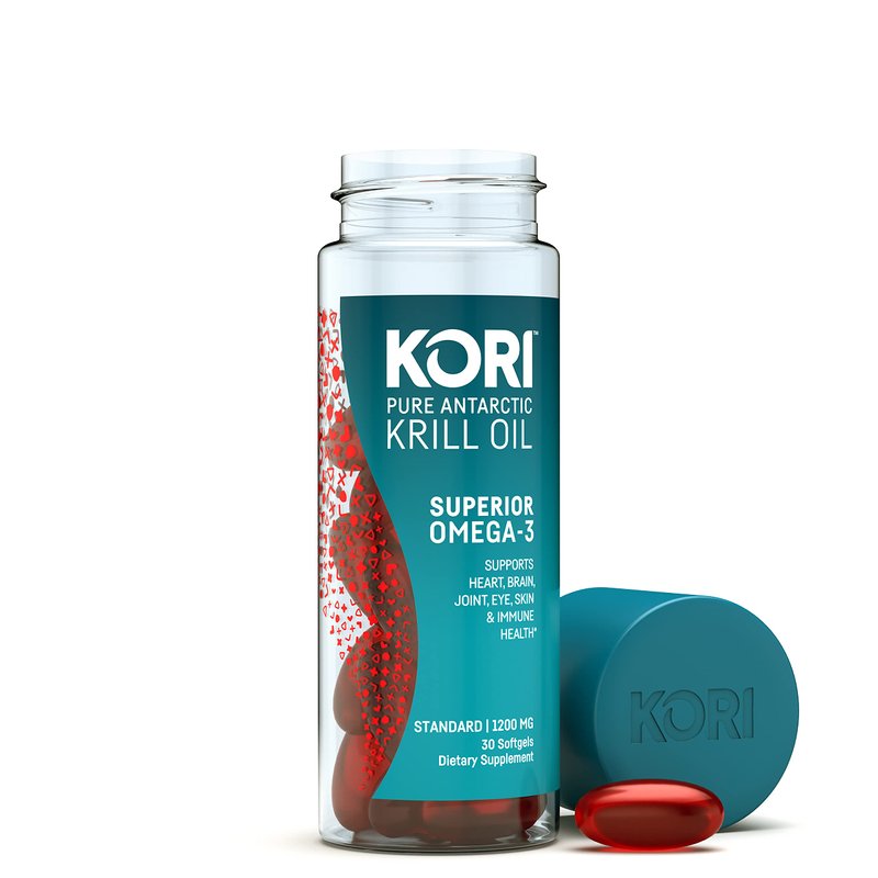 Kori Krill Oil is the Ocean's Superior Omega with more nutrients in their most natural form for your best whole-body health. Krill Oil Omega-3s provide multi-benefit support for heart, cardiovascular, brain, joint, eye, skin, imune, and whole body health. Krill Oil Omega-3s contain phospholipids our bodies prefer for superior absorption and bioavailbility versus fish oils, algae oils, and flaxseed oil supplements. Kori krill oil has no fish aftertaste or fishy burps. Sustainably sourced from pristine Antartica, the operations behind Kori Krill Oil has earned the highest sustainability credentials and is MSC certified. One softgel a day provides 140mg of EPA and DHA Omega-3s.