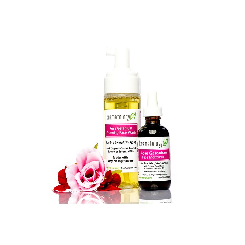 Who doesn't want to slow the aging process? Kosmatology’s face moisturizer for aging skin supports mature skin with a blend of essential oils that give free radicals (elements in our environment that breakdown cells) a one-two punch. Rose-Geranium will tighten skin and reduce large pores. It also offers anti-oxidant protection, prevents degeneration of cells, promotes cell renewal and proper blood circulation. All of these effects will help delay wrinkles and give your skin a more youthful look. Carrot Seed oil nourishes, tightens, rejuvenates and can help soften wrinkles. The base consists of a gentle blend of olive oil, coconut oil and castor oil.