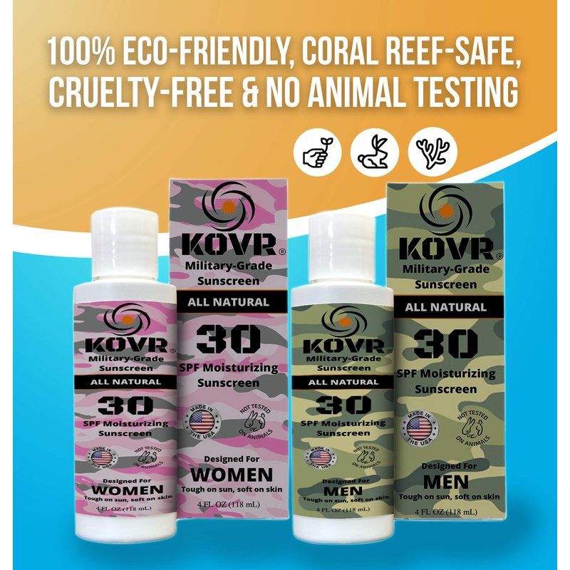 KOVR MILITARY GRADE SPF 30 SUNSCREEN – Kovr is your daily skin protectant for people that work and play outdoors. Water resistant, sweat resistant, and fragrance free, Kovr Sunblock provides broad spectrum UVA and UVB protection to guard against sun damage. With only 2 active mineral ingredients, Kovr is gentle on skin and coral reef friendly. Apply Kovr Mineral Sunscreen to your face and body all seasons of the year for maximum sun protection. American-made and veteran owned.
