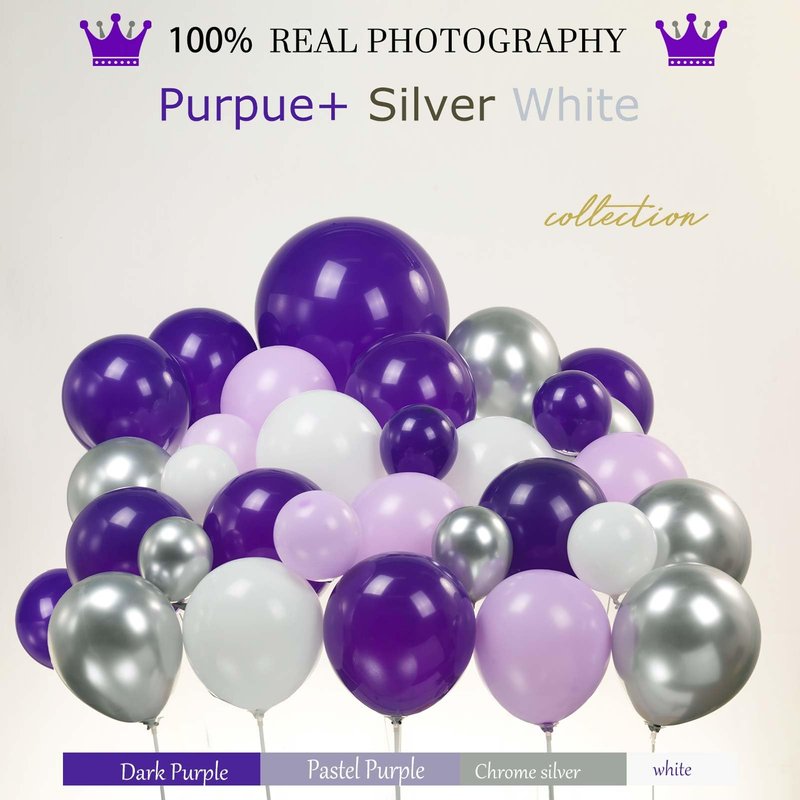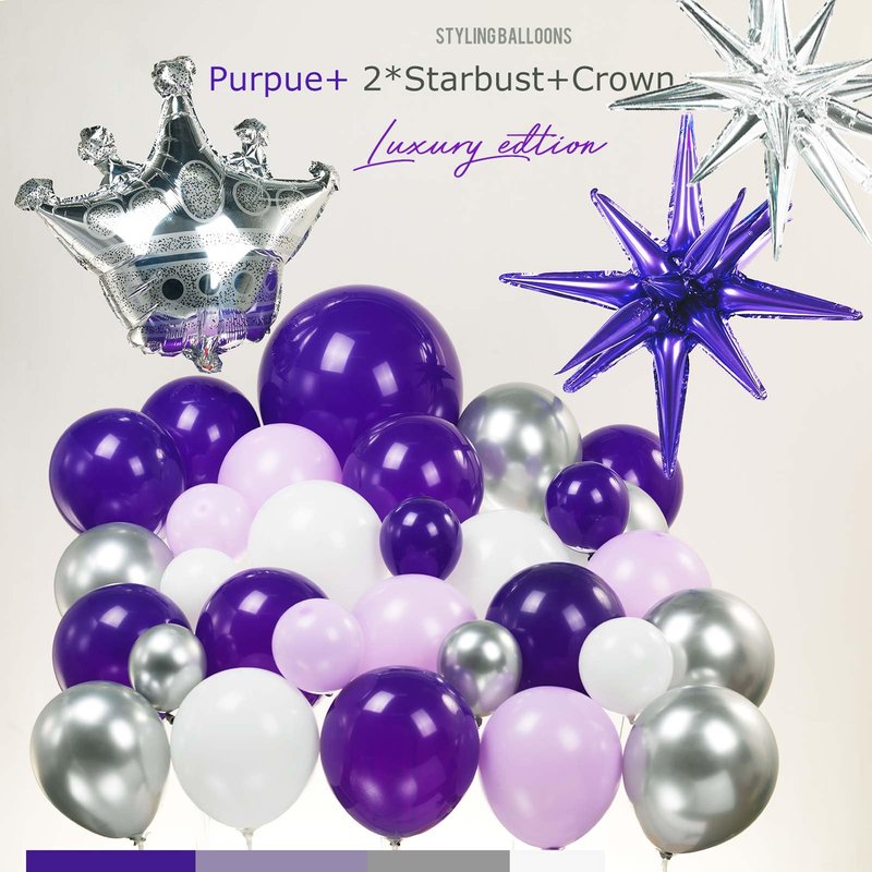 - 【126pcs All in 1 Packge】: these Luxury & Elegant dark royal purple and silver white Balloon Garland kit are Perfect for Wome Birthday and Graduation, Wedding Anniversary, office Party Decoration. 4sizes balloons, including Large 22 inch starburst balloon(2color) + crown balloons Will Bring Unforgettable Memories to Your Party.