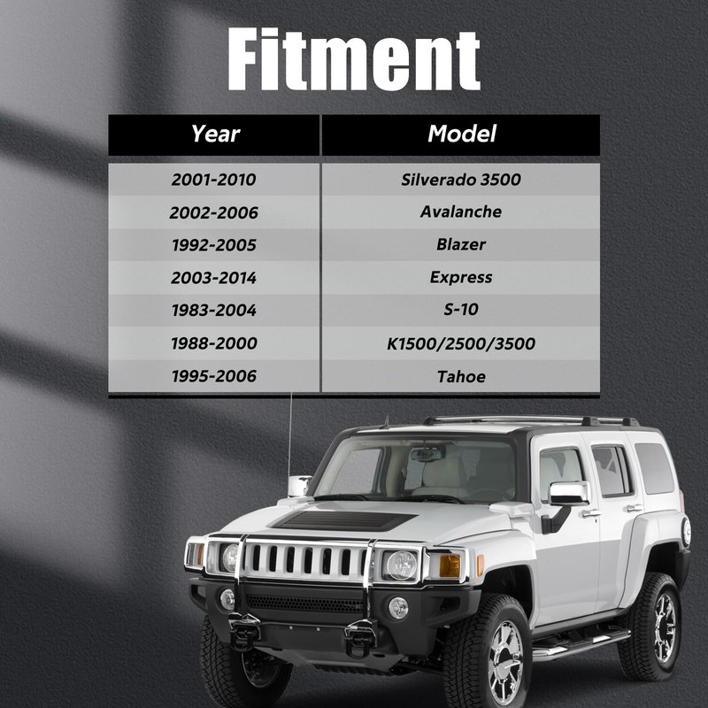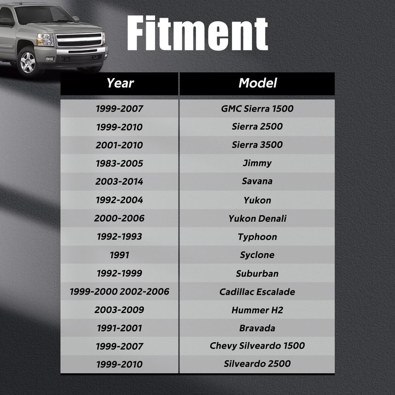 - 【Fit for】: Fits 1999-2007 Chevy Silveardo 1500, 1999-2010 Silveardo 2500, 2001-2010 Silverado 3500, 2002-2006 Avalanche, 1992-2005 Blazer, 2003-2014 Express, 1983-2004 S-10, 1988-2000 K1500/2500/3500, 1995-2006 Tahoe,1999-2007 GMC Sierra 1500, 1999-2010 Sierra 2500, 2001-2010 Sierra, 1992-2001 Jimmy, 2003-2014 Savana, 1992-2004 Yukon, 2000-2006 Yukon Denali, 1992-1993 Typhoon, 1991 Syclone,1992-1999 Suburban, 1999-2000 2002-2006 Cadillac Escalade, 2003-2009 Hummer H2, 1991-2001 Bravada