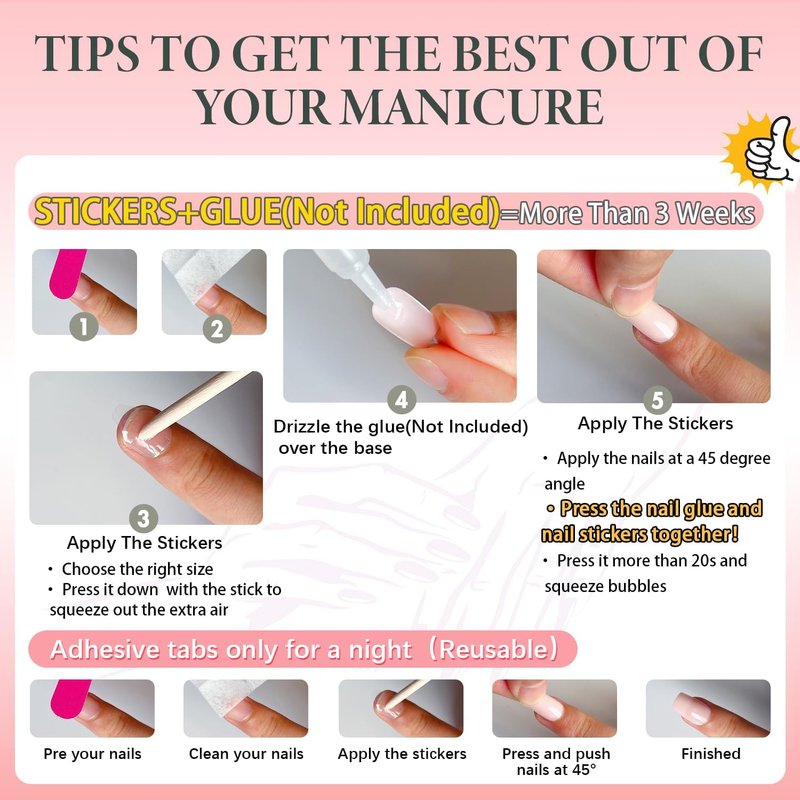 2.Please note that the nail glue is not included.If you want it last for a longer time,please use nail glue instead of the nail stickers.
