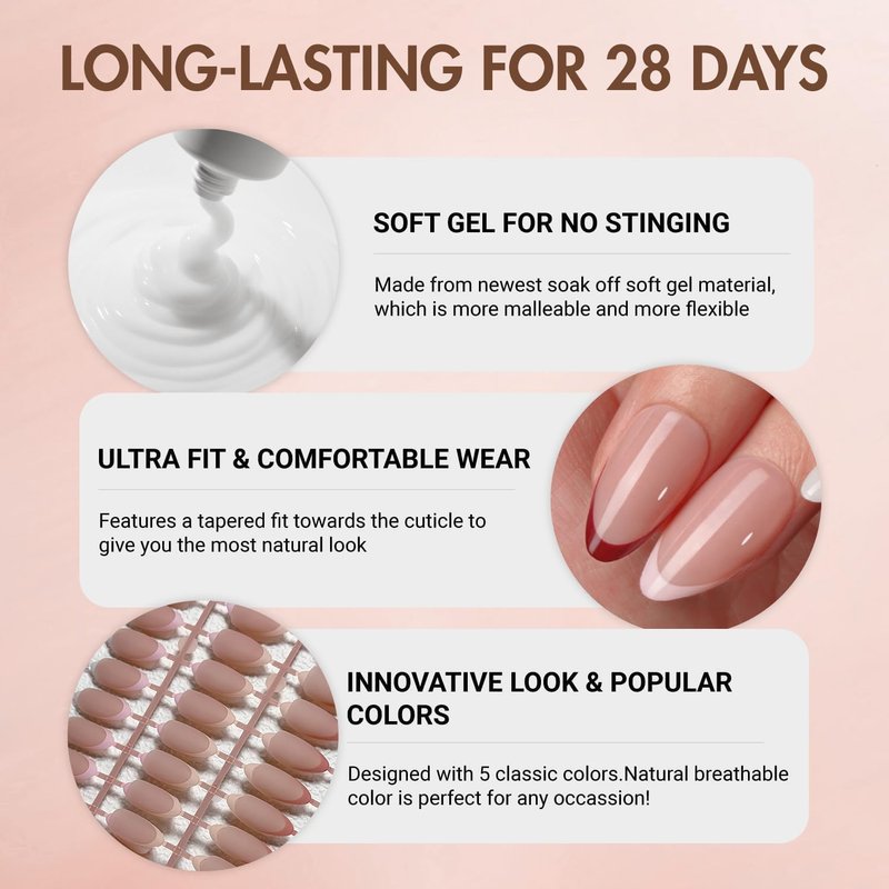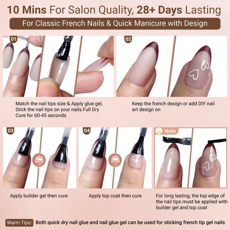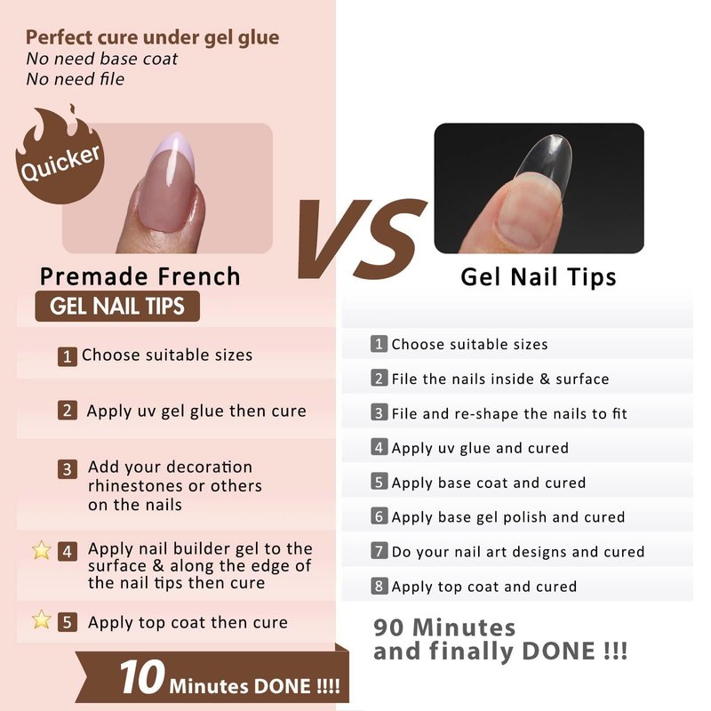 - Effortless Time & Cost Savings: Our colorful french tip soft gel nail tips are designed for convenience with pre-applied tip primer and base coat cover.Whether you're a beginner or a pro,achieving salon-quality gel tip nails kit acrylic set is a breeze and takes just 20 minutes!If you’re looking for a simple set in a hurry that’ll be worth your buck