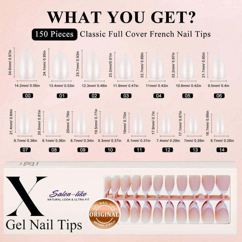 -150 pcs french tip gel x nails in 15 sizes (10 tips per size).<br>
