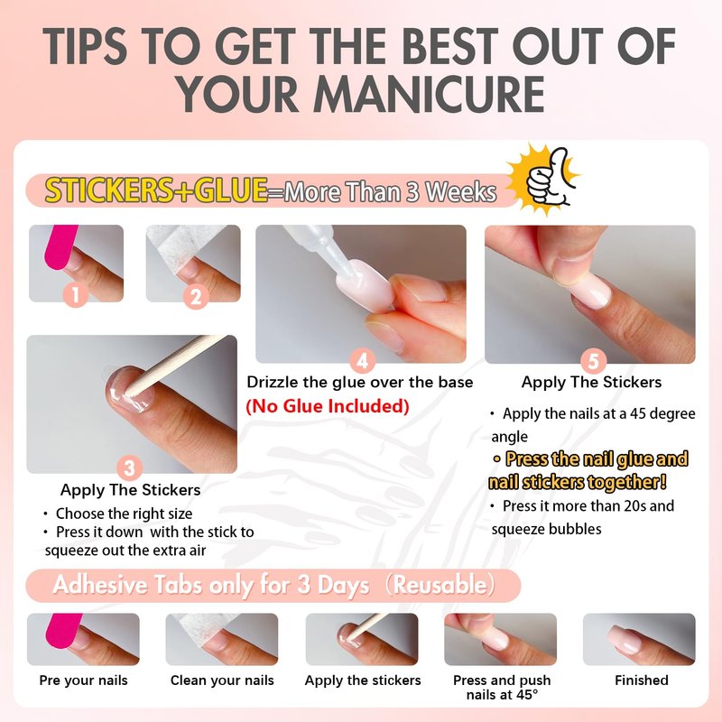 2.If you want it last for a longer time,please use nail glue instead of the nail stickers.