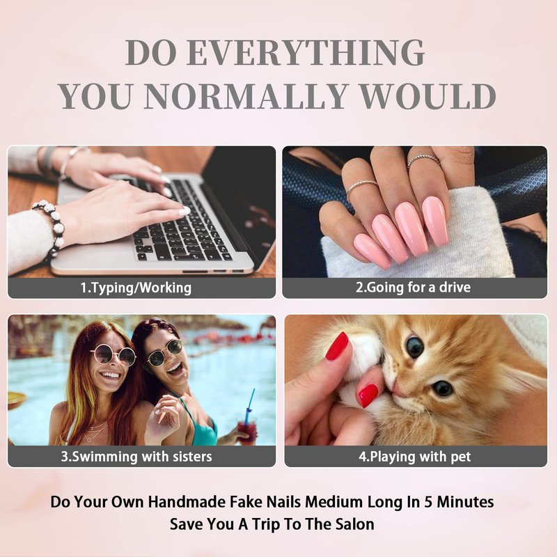 - 【❀Glue on Nails Medium Length】KQueenest gel press on nails coffin medium length are made of high quality acrylic material.False nails glue on are lightweight and comfortable to wear,providing a seamless fit that won't hinder your daily activities.Natural enough just like the perfect salon style!